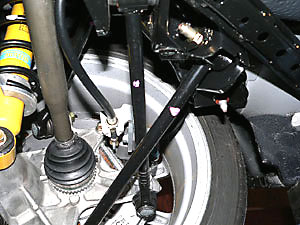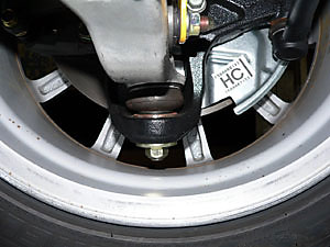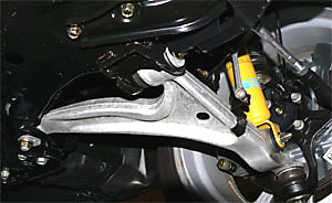 フロントロアアーム アルミ製です。 かなりしっかりとした作りになっています。 左フロントの写真ですがロアアームリア側のブッシュの取り付け方法に注目! 最近のトヨタ車に見られる固定方法です。 ピロボールなどを採用すると、ロアアームの角度が重要なポイントとなり、車高の高さも指定されそうです。 かなり柔らかいブッシュなんだろうな・・・ |